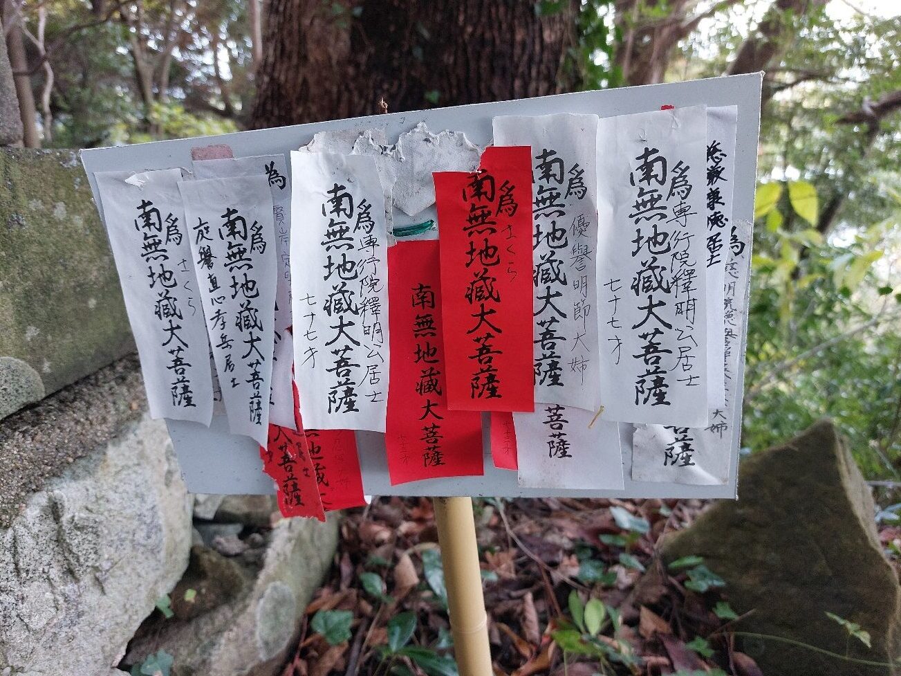 身内に不幸があったとき、亡くなった人の霊を守ってもらうようにと七日ごとにお地蔵さまに白い札を貼り、四十九日目には赤い札を貼るというもの。