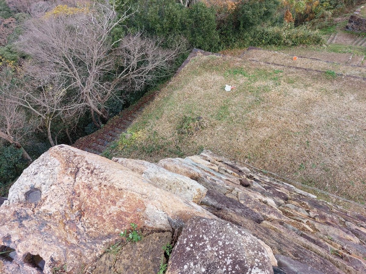 米子城は、かつてちょっと段差のある土地に2つの天守があったそうで(今はない)その上のほうの天守があったところから下の天守(櫓か)を眺めたところです。